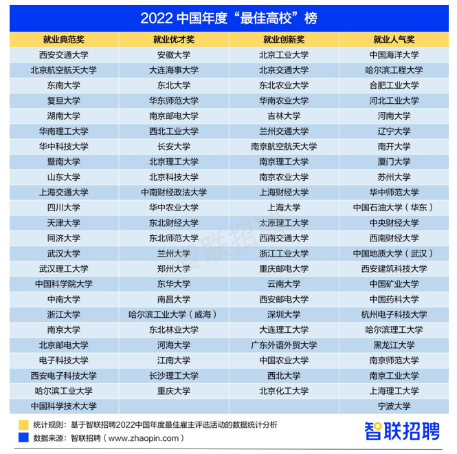 2022中国年度最佳雇主评选中,有近百所高校获得“最佳高校”奖——最佳高校就业典范奖、最佳高校就业优才奖、最佳高校就业创新奖和最佳高校就业人气奖。