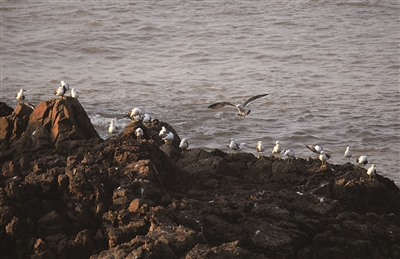 黄昏时分的过水屿,像极了海上的小草原,充满诗意。草坪尽头的礁石上,栖息了无数海鸥,声声叫唤。