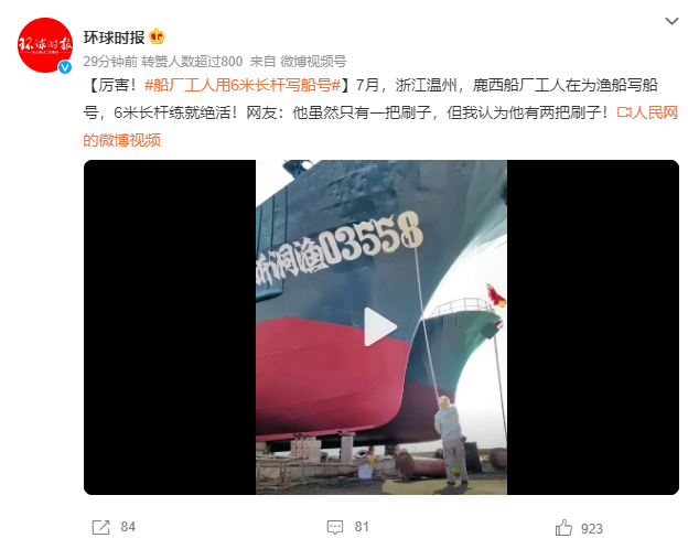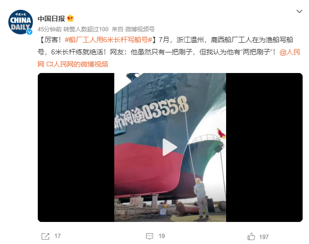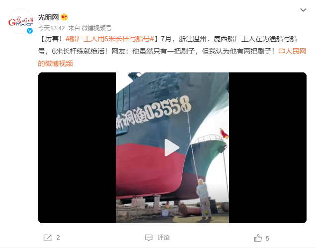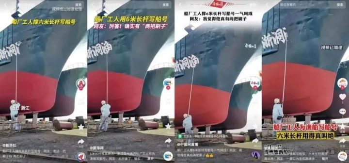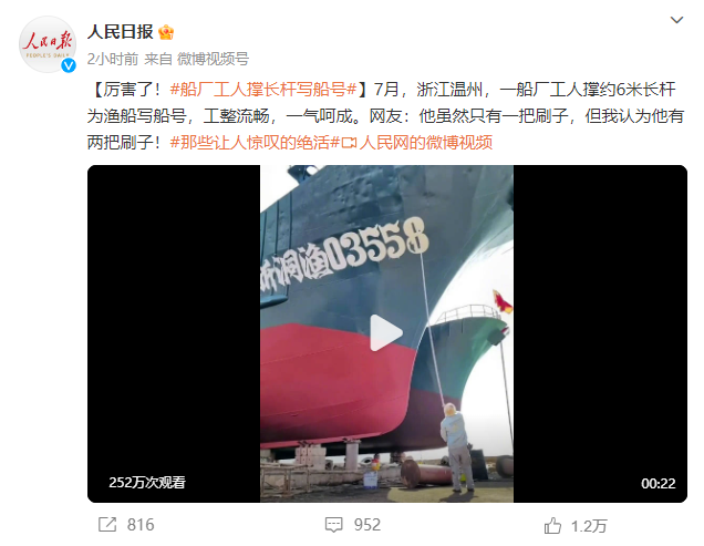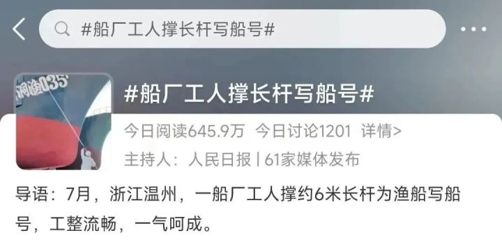 7月13日,人民日报和人民网的官方微博相继展示了温州洞头船厂工人撑长杆写船号的视频,让人惊叹的绝活引发全网热议,一度登上微博“要闻榜”热门第一。