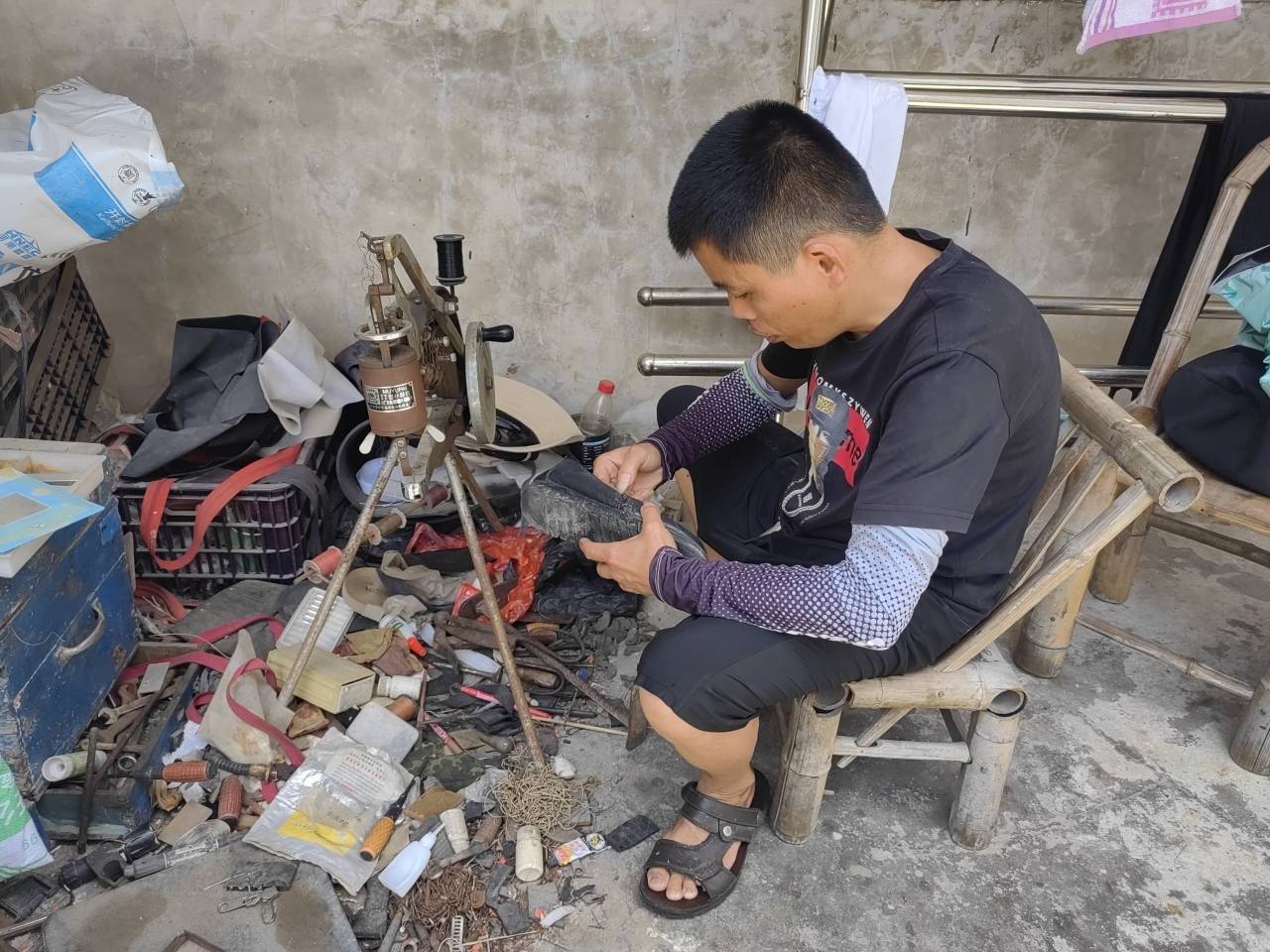 一台补鞋机、一条竹凳子,在温州乐清市天成街道万泽社区万泽前村,今年44岁的赵日开在家门口摆了一个补鞋摊,等待着上门修鞋的周边群众。