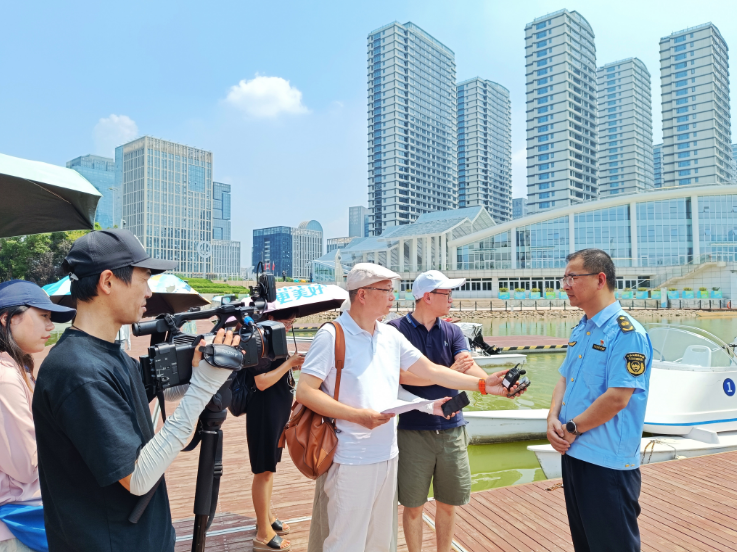在龙舟湖码头附近,一块由单独划分出来的水域引起了探访团的注意。原来,这里是温州大学生命与环境科学学院李仁辉教授藻类防控专家团队对赛道进行藻类治理预防工作的一块测试区。该团队将超声波技术与传统的除藻技术联合作用于河道内生长的藻类水华,有效提升了测试区水域的水质。“目前测试区的效果非常好,能见度已经达到1.8米到2米左右。”林玉龙介绍道。