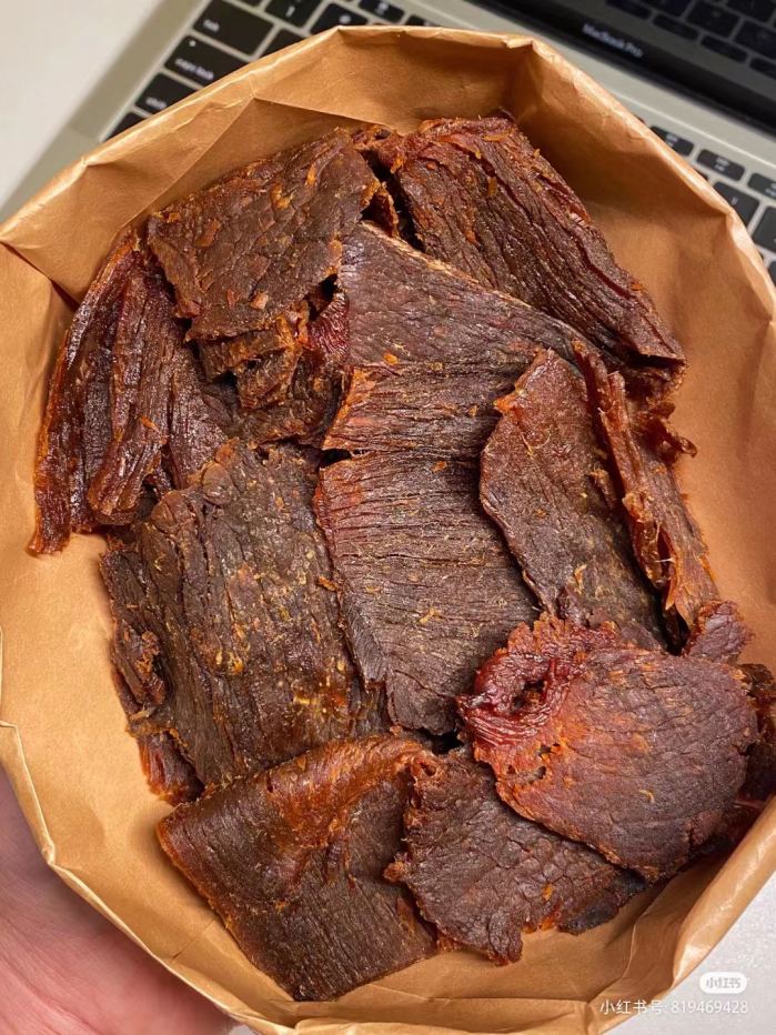 湖岭牛肉干,我愿称之为零食界永远的神!牛肉干湿湿软软又很有嚼劲,不干不柴,一口下去还带着略微软糯的筋。能够让吃遍天下的美食大咖都为之折服,湖岭牛肉确实是有点东西的!