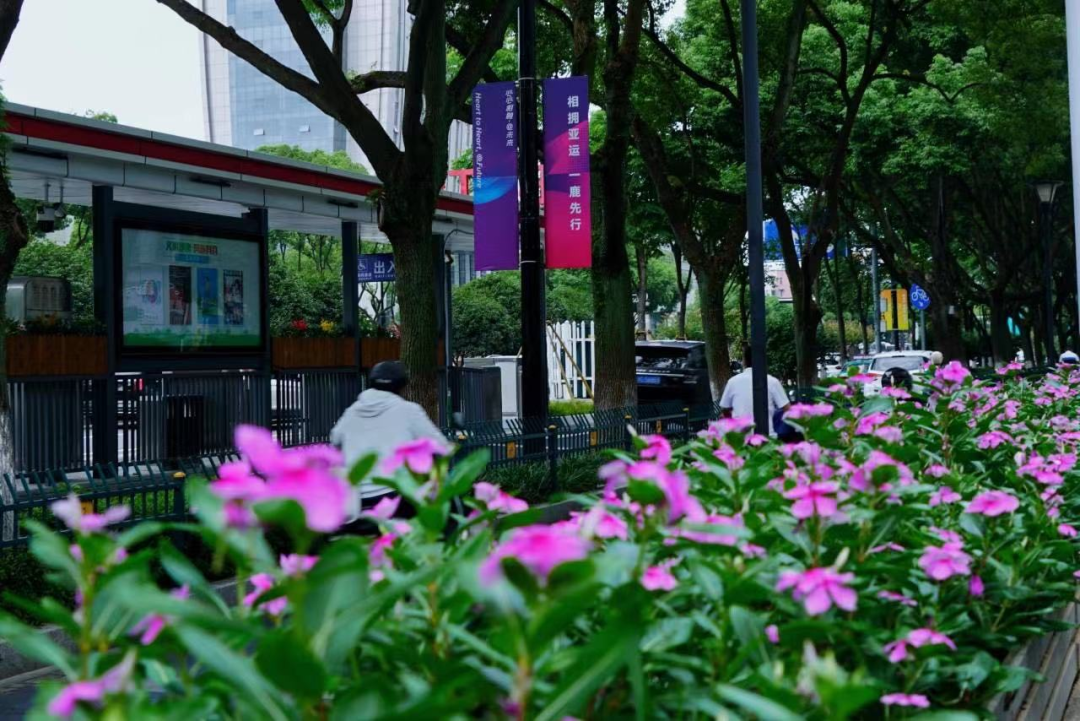 在温州市区锦绣路,500余株紫薇花迎风盛放,如团团花雾,与亚运会会徽、吉祥物、宣传口号等元素巧妙相融。
