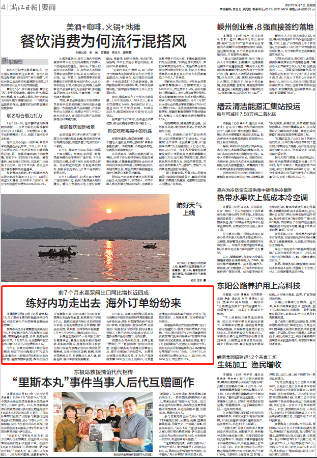 泵阀是山区县永嘉重要的传统支柱产业,不少泵阀企业大力拓展海外市场业务,密集赴海外参展、洽谈,频频斩获海外订单。1月至7月,全县泵阀产业实现出口额14.4亿元,同比增长37.4%。