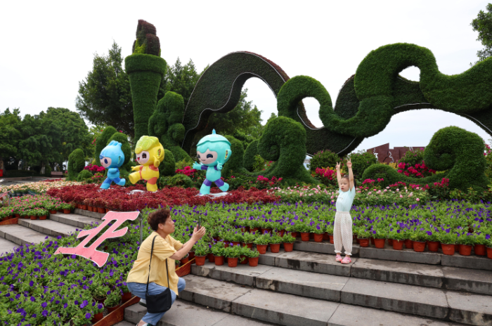 市民正在瓯江路新近完工的“潮涌瓯江,未来可期”喜迎亚运大型绿雕旁游玩。郑鹏 摄