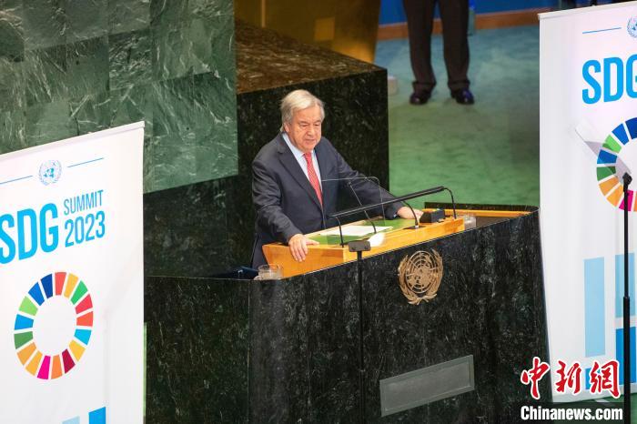 当地时间9月18日,联合国可持续发展目标峰会在纽约联合国总部拉开帷幕。当天,联大通过一项政治宣言,会员国承诺加速实现2030年可持续发展目标。图为联合国秘书长古特雷斯发表讲话。 中新社记者 王帆 摄
