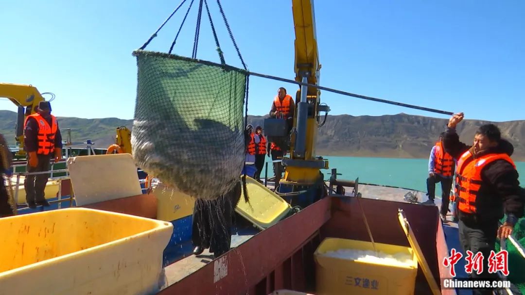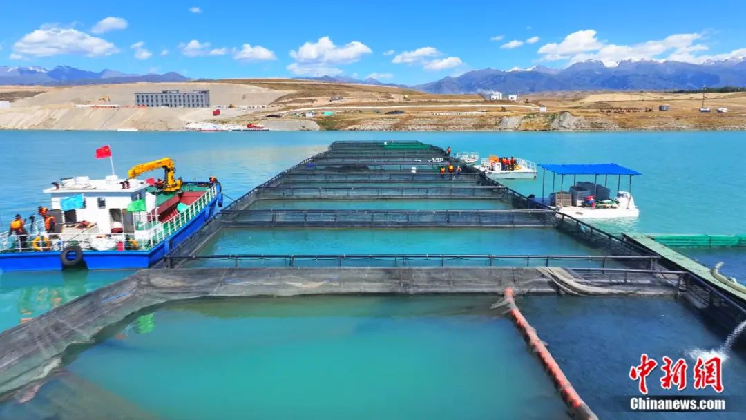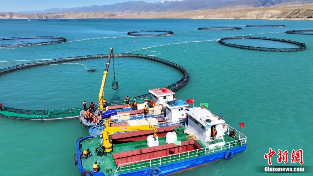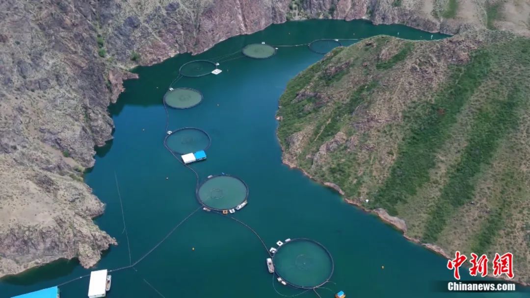 目前,尼勒克县已经形成了完整的数字化渔业产业链,精准把控养殖、加工、储运、销售等各环节。在尼勒克县的三文鱼养殖基地,水面上一个个巨大的圆圈就是当地的大型生态环保网箱。工人们用自主研发并取得专利的远距离智能投饵系统给鱼喂食。这个系统可以通过对水温、水溶氧、鱼体总量的统计,科学合理地计算出投喂量,实现精准投撒,大大节约了人力。