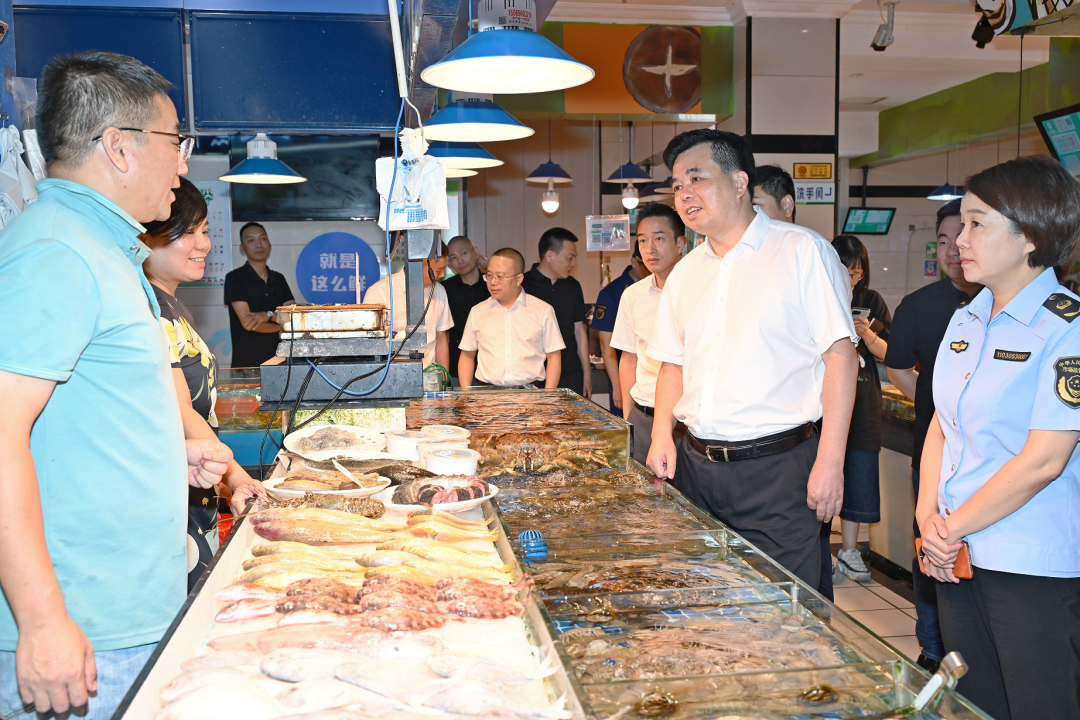 在城南街道清和农贸市场,徐建兵一行来到水产区与摊主交谈,“最近生意如何”“怎么进货怎么配送的?”……详细了解食品安全检测等情况后,徐建兵叮嘱主管部门和市场运营单位,要紧盯食品安全和供应工作,精心组织货源,加强生产、运输、加工、销售全链条管理,保障群众“舌尖上的安全”,更好满足节日采购需求。徐建兵一行还来到乐清经济开发区,走访乐清乐联商贸有限公司,详细询问大型商超的货源、价格、供应等情况,并检查食品安全、消防安全措施落实等。徐建兵要求,严把食品安全关、质量关,加强消防设备隐患排查,确保每个环节不能有丝毫疏漏,让顾客买得放心、吃得舒心。