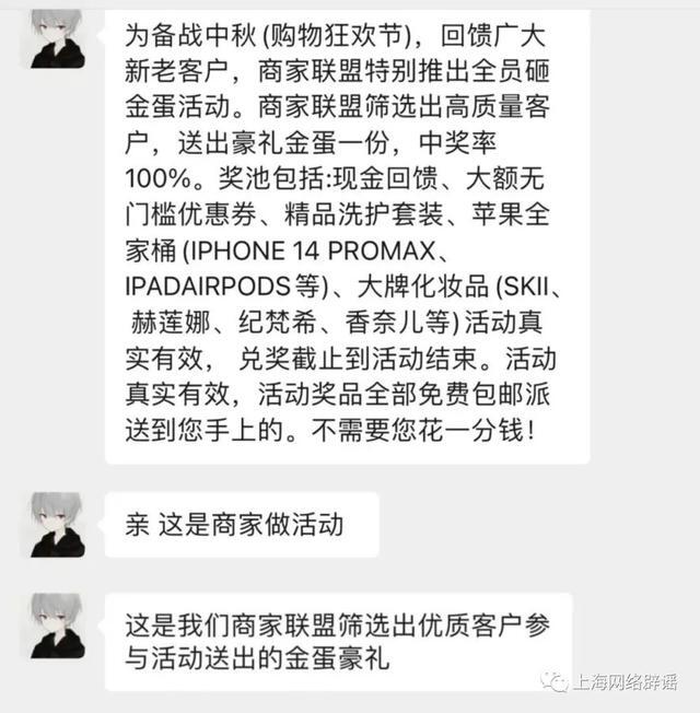同时,所谓“客服”还会反复强调这是商家联盟的抽奖活动,仅针对优质客户。但实际上,包括美团、京东、微信等相关平台早已发过声明,从未进行过类似的反馈赠礼活动,也不会通过客服联系用户要求加群、派发红包等。