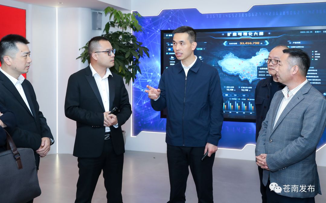 浙江千藤矿业科技有限公司是一家致力于推动矿山行业数字科技与产业创新的服务平台,依托苍南矿山井巷特色产业基础,通过“互联网+数字化”建设模式,提供一站式服务和定制化解决方案。张本锋现场查看了矿权交易驾驶舱、矿业可视化大屏等数字化管理平台,并针对企业提出的相关问题进行现场分析研究,提出解决方案和发展要求。