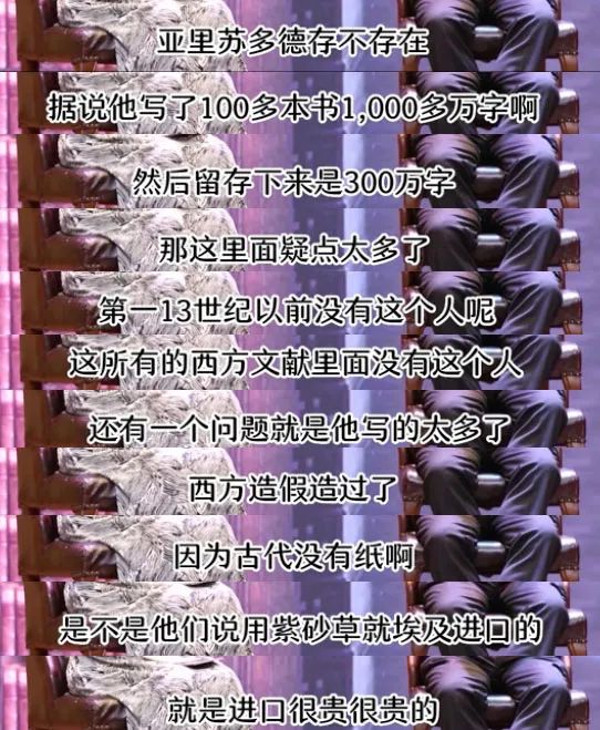 相关视频描述了一个观点:“十三世纪前没有这个人(亚里士多德)呢,这所有的西方文献里面没有这个人,突然冒出来的。”这个问题的观点那可就更大了,因为它是对《希腊伪史考》一书的误读——而《希腊伪史考》里的说法则又是对所引材料的误读。所以,“十三世纪之前没有亚里士多德”是一个“误读+误读”的大错误。