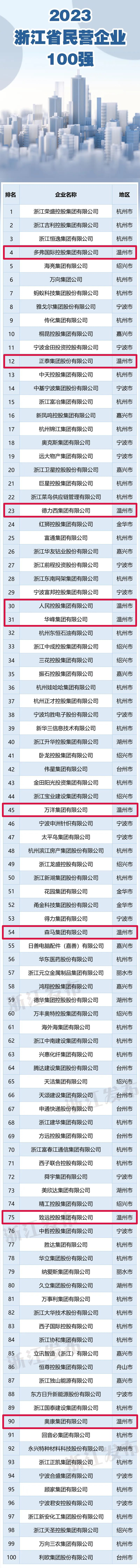 温州网讯 近日,省市场监督管理局、省工商业联合会公布“2023 年度浙江省民营企业百强榜单”。其中,温州9家上榜!