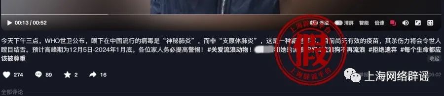 上海辟谣平台在核查中发现,不少自媒体在传播“世卫组织宣布‘神秘肺炎’”时,存在断章取义、以偏概全的做法,包括曲解世卫组织官方声明、只字不提国家卫健委发布的信息等;还有部分自媒体将网传不实文字与账号日常视频相结合,没有任何根据地声称“今天下午3点宣布”“昨天下午3点宣布”等。