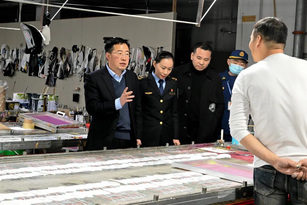 随后,李坚走访了真诚印花加工厂、太子博服饰等企业,与企业相关负责人深入交谈,查看场所疏散通道、电器线路等方面的安全生产和消防安全落实情况。
