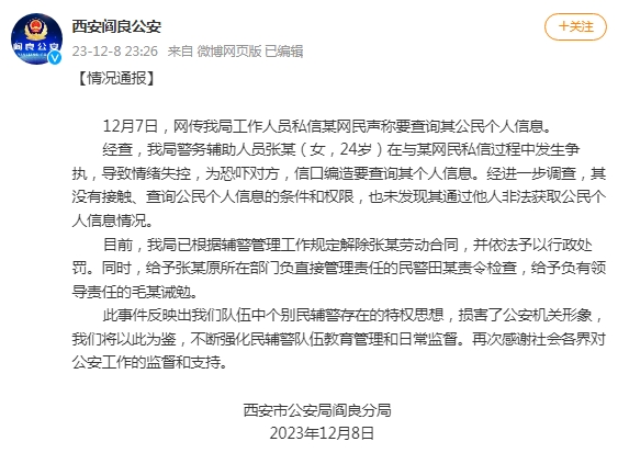 经查,西安市公安局阎良分局警务辅助人员张某(女,24岁)在与某网民私信过程中发生争执,导致情绪失控,为恐吓对方,信口编造要查询其个人信息。经进一步调查,其没有接触、查询公民个人信息的条件和权限,也未发现其通过他人非法获取公民个人信息情况。