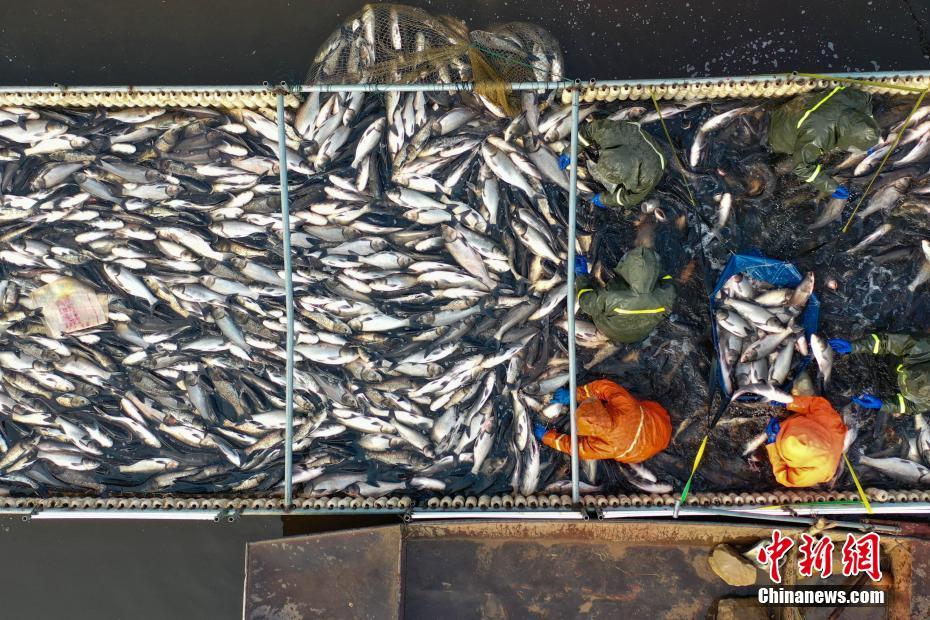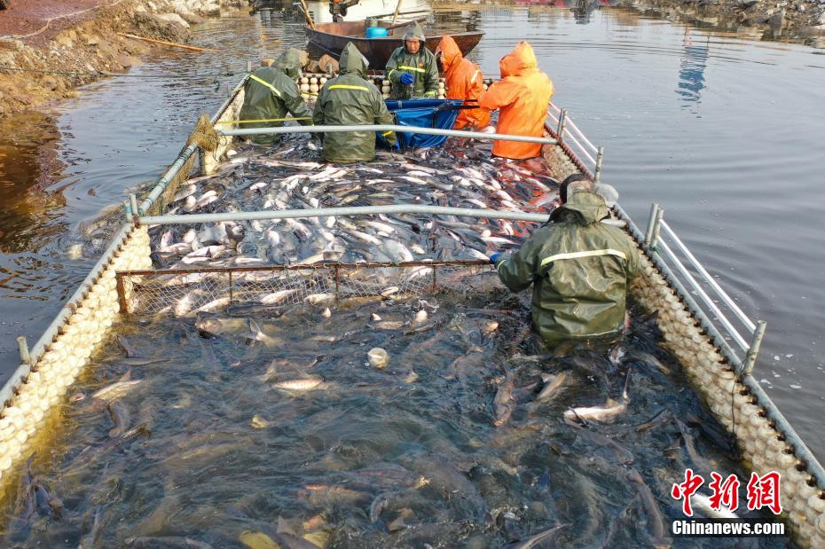 近日,河南省宝丰县张八桥镇河陈水库迎来冬捕季,河面上鱼跃人欢,养殖户们忙着捕捞、分拣,准备外运,供应即将到来的春节市场。近年来,张八桥镇依托当地独特的水资源和生态优势,大力发展水产养殖,成为农民增收的有效途径。何五昌 摄
