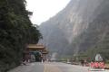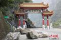 4月4日是台湾花莲7.3级地震发生的第二天,搜救工作重点在太鲁阁区域。图为位于太鲁阁公园的中横公路入口,立雾溪出海口两侧山体有明显滑坡痕迹。“东西横贯公路”牌楼前,靠山体一侧道路落满大石。中新社记者 杨程晨 摄