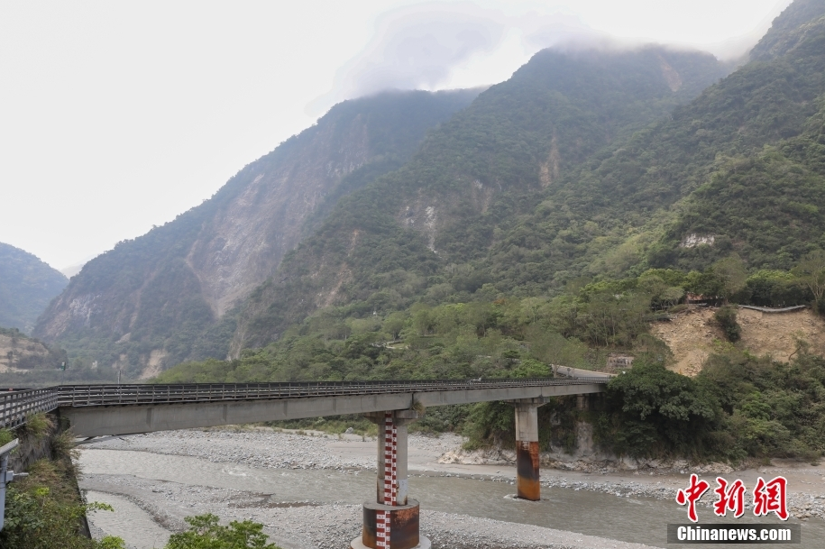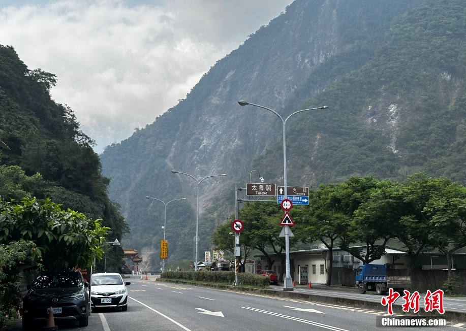 4月4日是台湾花莲7.3级地震发生的第二天,搜救工作重点在太鲁阁区域。图为位于太鲁阁公园的中横公路入口,立雾溪出海口两侧山体有明显滑坡痕迹。中新社记者 杨程晨 摄