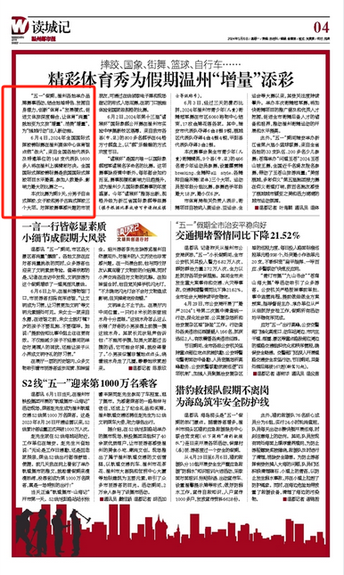 此外,“五一”期间瑞安举办浙江省第六届小篮球联赛,来自全省各地的33支队伍、200多名少儿参赛;苍南举办“问道玉苍”2024玉苍山坡王赛,全国近千名骑友报名参赛,带动了玉苍山旅游流量;“美丽鹿城,多彩仰义”第五届跑团接力赛在仰义街道打响,数百名跑友感受了鹿城城市蝶变之美和活力满满的城市运动氛围。