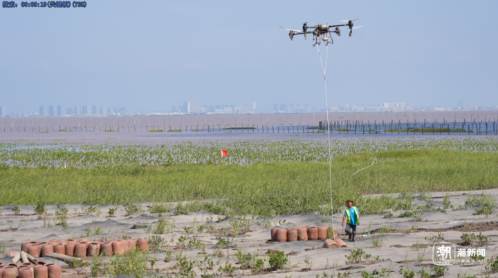 为确保红树林湿地整体生态环境稳定,瓦缸采用无人机运送。记者在现场看到,在工作人员操控下,一只只生态瓦缸被有条不紊地运至红树林湿地内。相比人工,效率提高近四成。