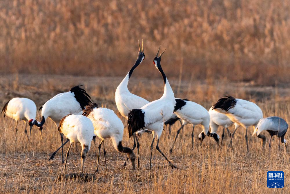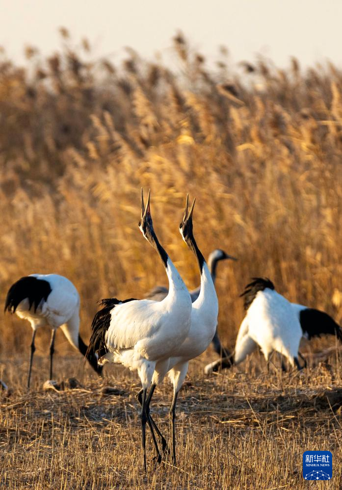 12月15日,丹顶鹤在江苏盐城湿地珍禽国家级自然保护区内栖息觅食。目前,大批丹顶鹤飞抵江苏盐城湿地珍禽国家级自然保护区越冬。该保护区位于黄海之滨,是全球9条候鸟迁飞通道之一的“东亚-澳大利西亚”路线上的重要一站,每年都有超过600只野生丹顶鹤来这里越冬。新华社发(汤德宏摄)