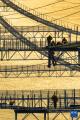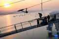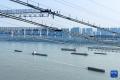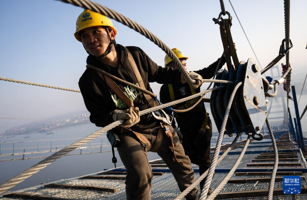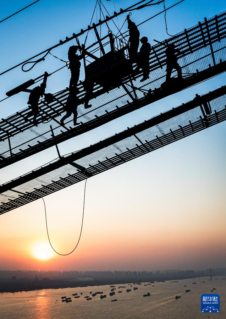 近日,在燕矶长江大桥的猫道面网铺设施工现场,建筑工人在距离江面近200米的高空作业,伴着脚下的长江波涛,稳步推进工程建设。