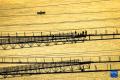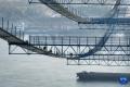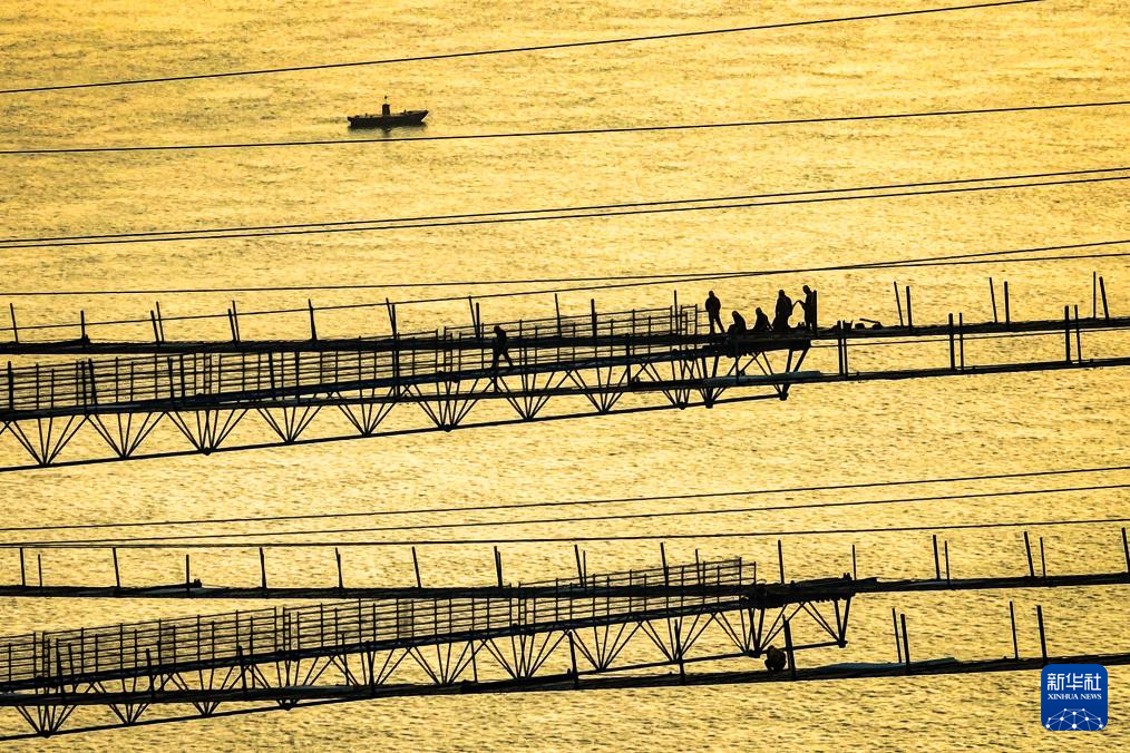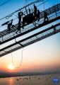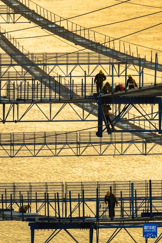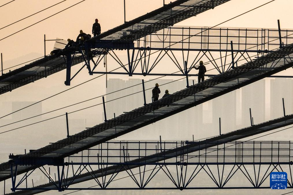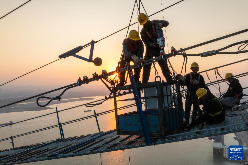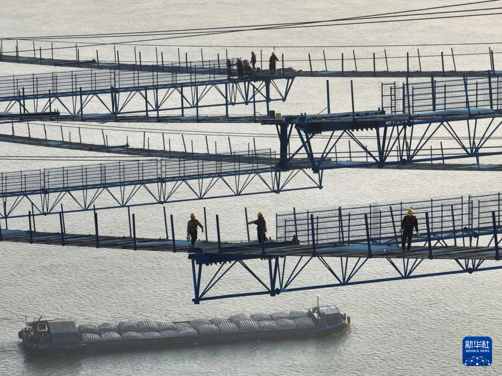 12月16日,中铁大桥局工人在燕矶长江大桥的猫道上施工(无人机照片)。