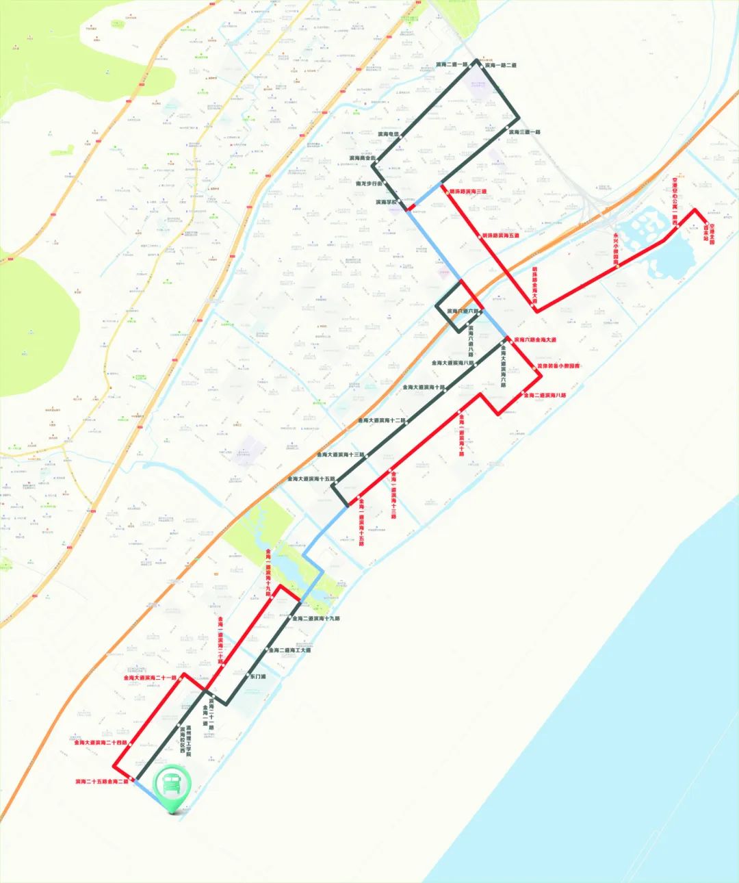 取消站点:滨海三道一路、滨海一路二道、滨海二道一路、滨海电信、滨海商业街、南龙步行街、滨海学校、滨海六道八路、滨海六道六路、金海大道滨海六路、金海大道滨海八路、金海大道滨海十路、金海大道滨海十二路、金海大道滨海十三路、金海大道滨海十五路、金海二道滨海十九路、金海二道海工大道、东门浦、滨海二十一路金海一道、温州理工学院滨海校区西