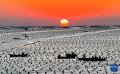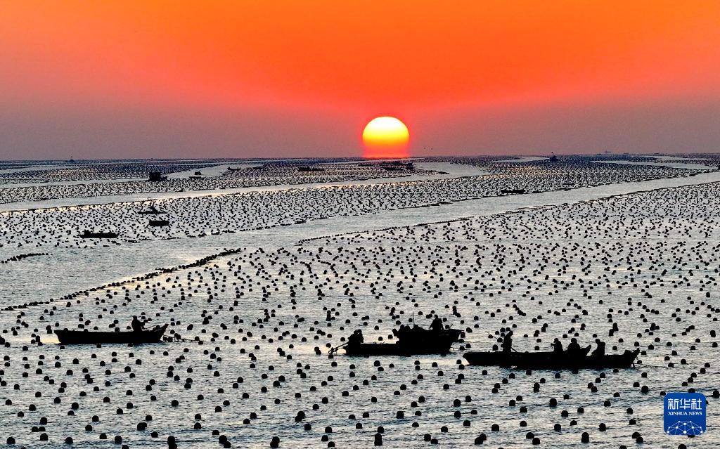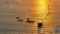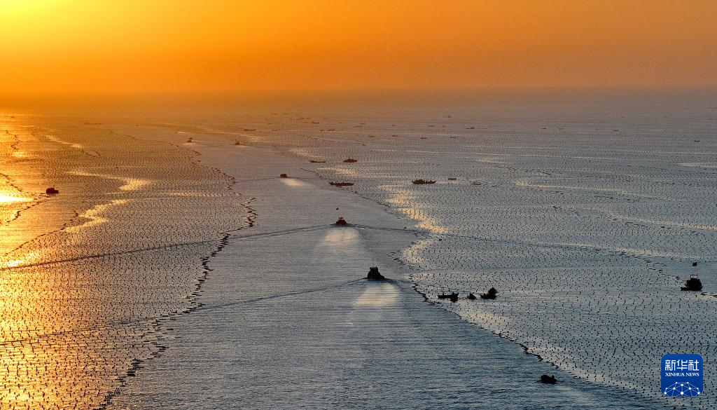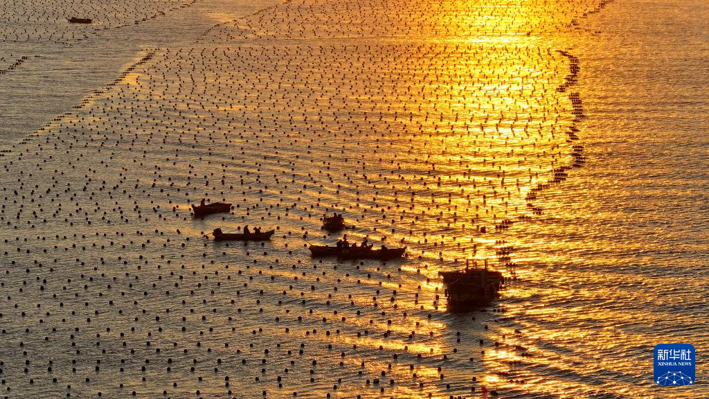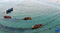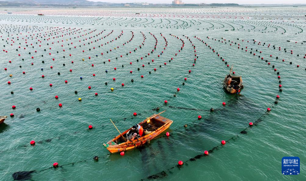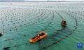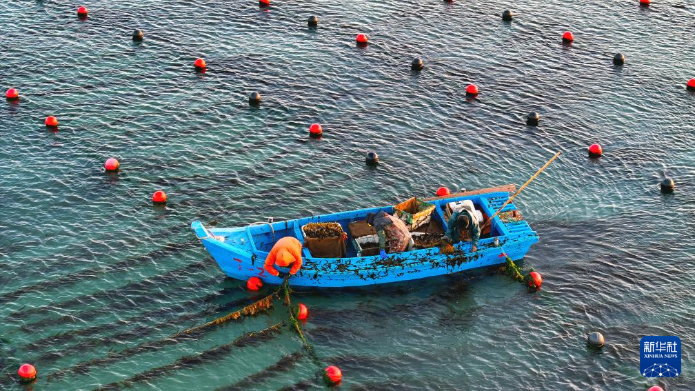 12月29日,在山东省荣成市爱伦湾海洋牧场,渔民驾驶渔船在生态网箱养殖区管理海带(无人机照片)。