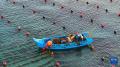 12月29日,在山东省荣成市爱伦湾海洋牧场,渔民驾驶渔船在生态网箱养殖区管理海带(无人机照片)