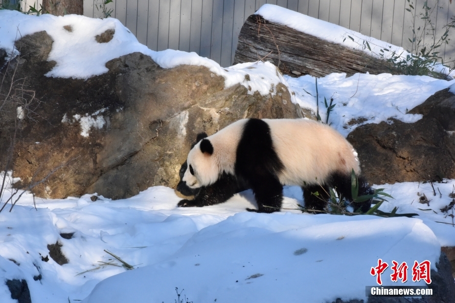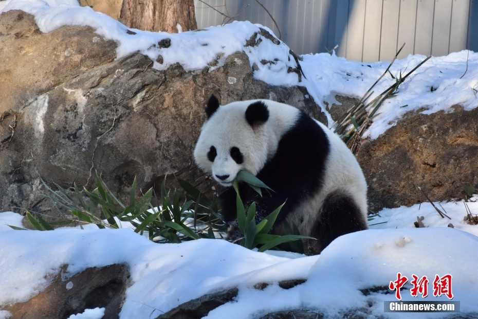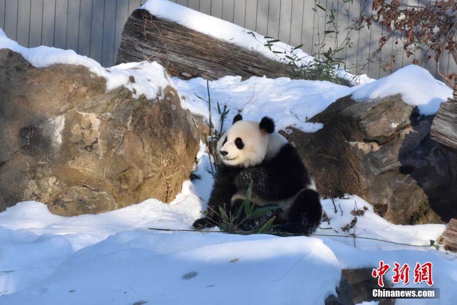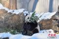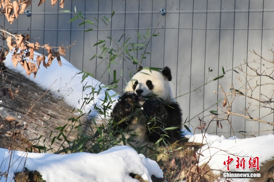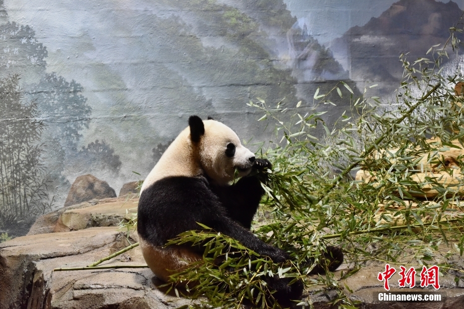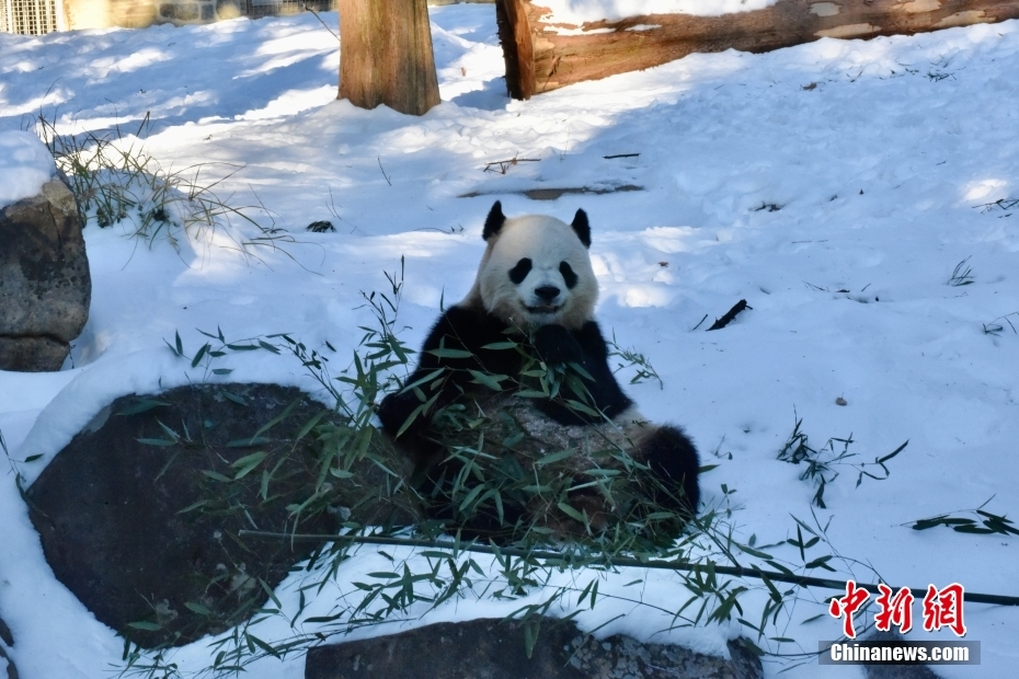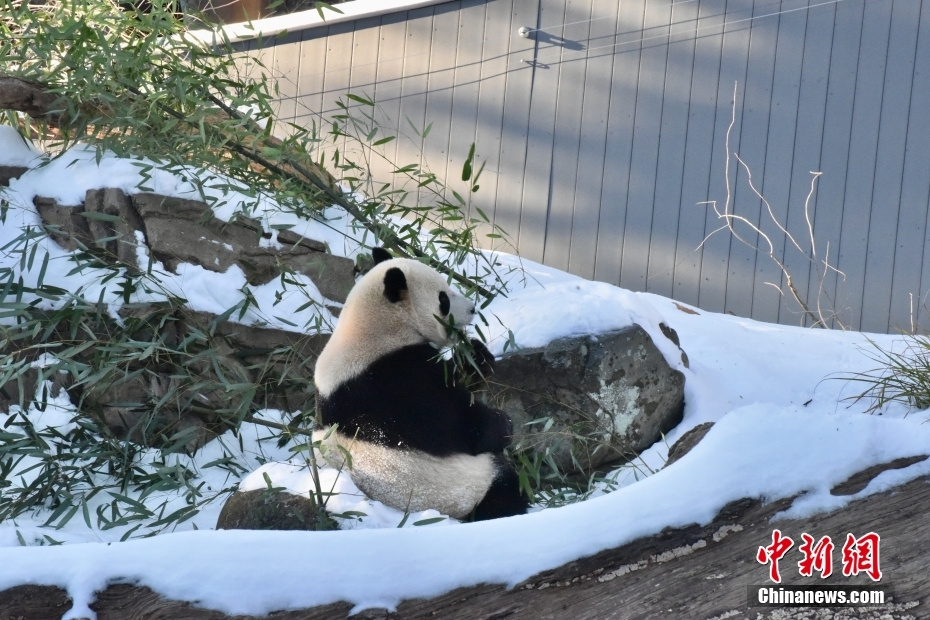 当地时间1月9日,美国华盛顿国家动物园熊猫馆馆长迈克尔·布朗-帕尔斯格鲁夫(Michael Brown-Palsgrove)表示,大熊猫“宝力”和“青宝”“已经完全准备好”与公众见面。图为“青宝”在吃竹子。中新社记者 沙晗汀 摄