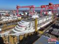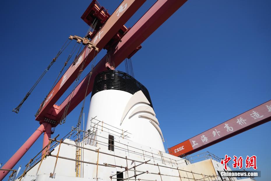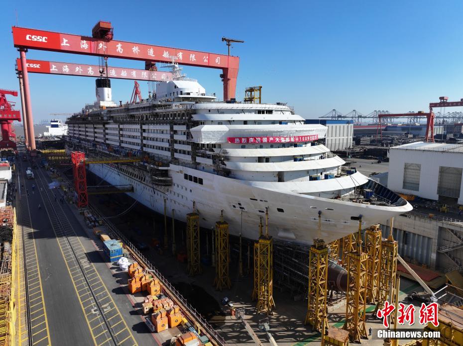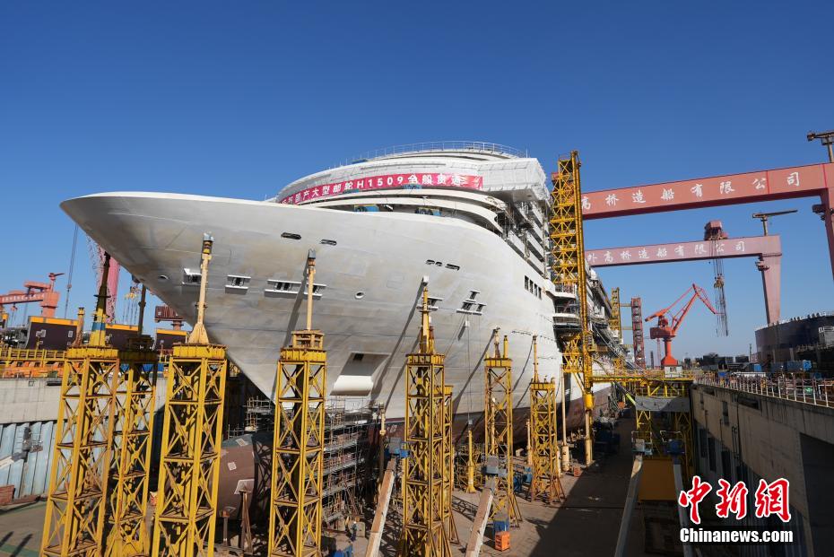 1月15日,随着邮轮大烟囱的吊装到位,备受关注的第二艘中国国产大型邮轮H1509船(“爱达·花城号”)在中国船舶集团有限公司旗下上海外高桥造船有限公司2号船坞内实现了全船贯通,下一步将转入全船内装工程、设备、系统调试。据悉,较首制船“爱达·魔都号”,H1509船总吨位增加了0.64万吨达14.19万吨,总长增加17.4米达341米,客房数量增加19间达2144间,满载游客量5232人。中新社记者 张亨伟 摄