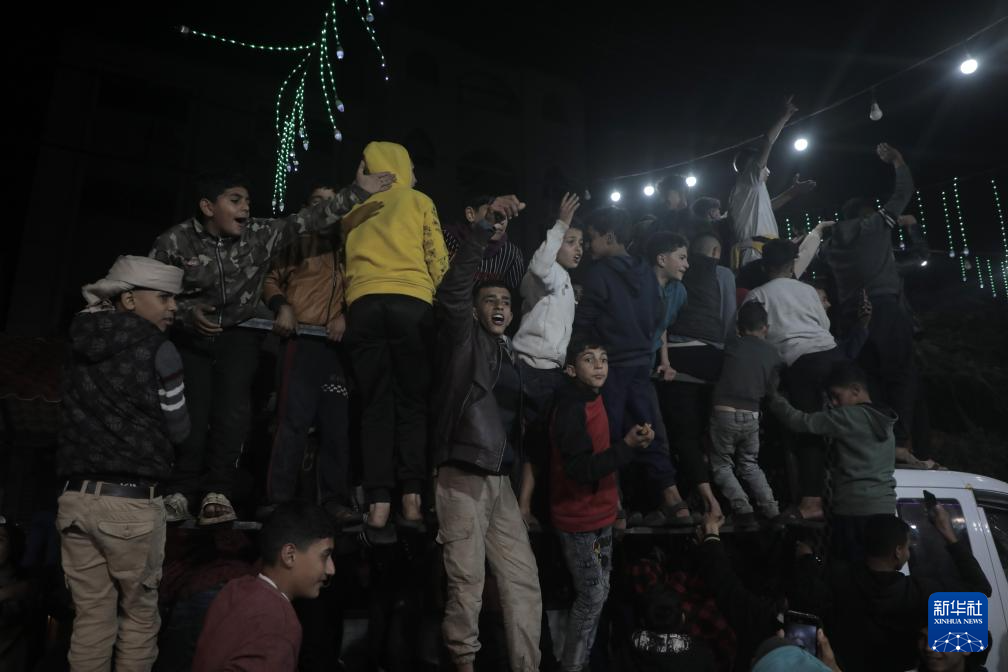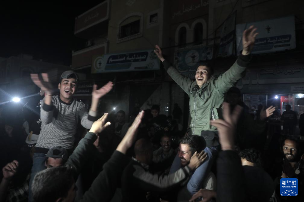 1月15日,人们在加沙地带代尔拜拉赫庆祝停火协议达成。卡塔尔首相兼外交大臣穆罕默德15日晚在卡塔尔首都多哈宣布,以色列与巴勒斯坦伊斯兰抵抗运动(哈马斯)已就加沙地带停火达成协议。