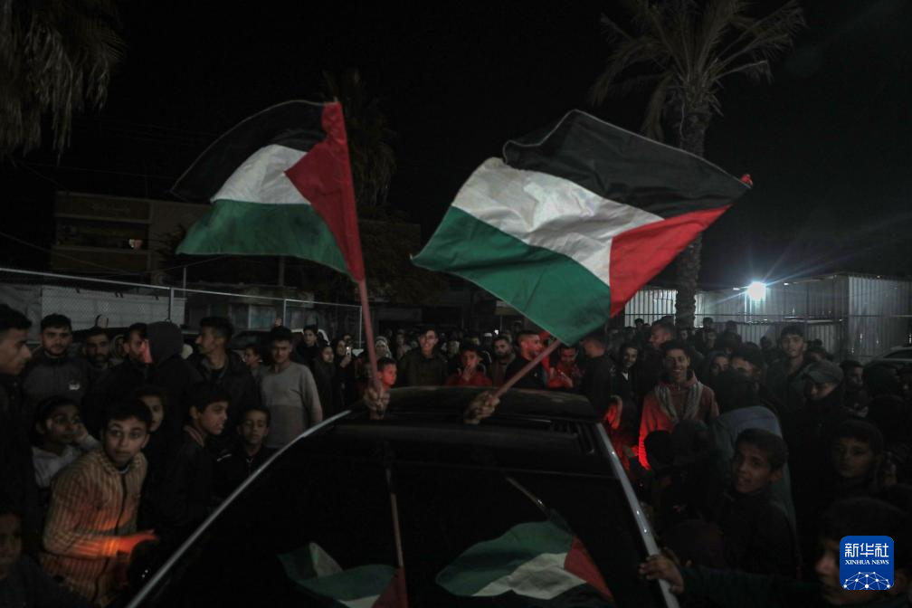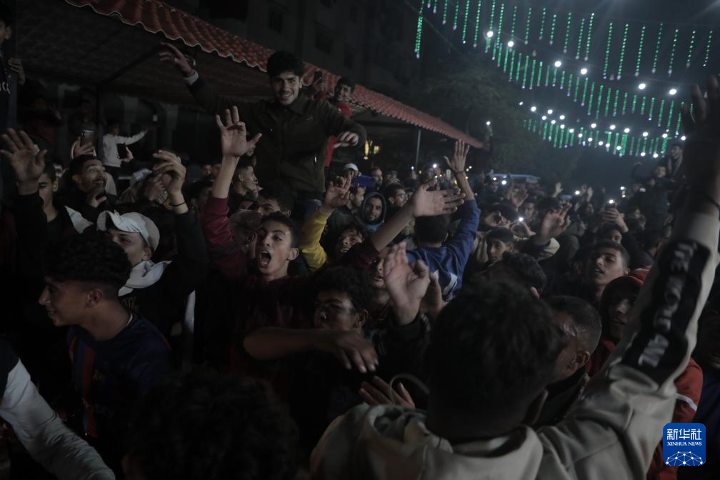 1月15日,人们在加沙地带代尔拜拉赫庆祝停火协议达成。卡塔尔首相兼外交大臣穆罕默德15日晚在卡塔尔首都多哈宣布,以色列与巴勒斯坦伊斯兰抵抗运动(哈马斯)已就加沙地带停火达成协议。里泽克·阿卜杜勒贾瓦德摄