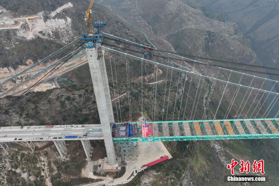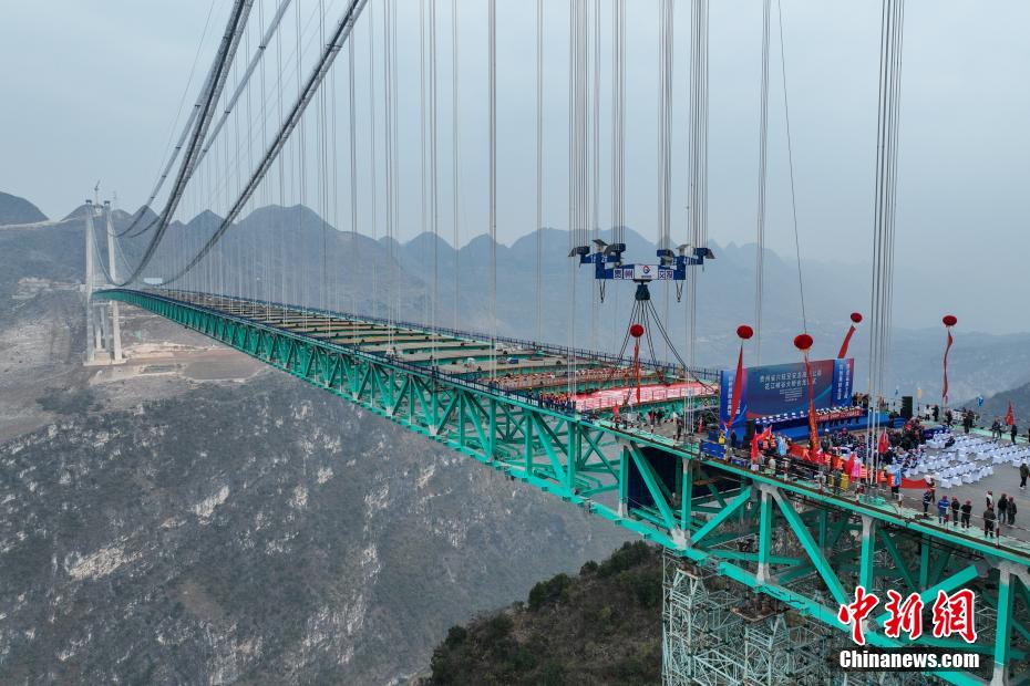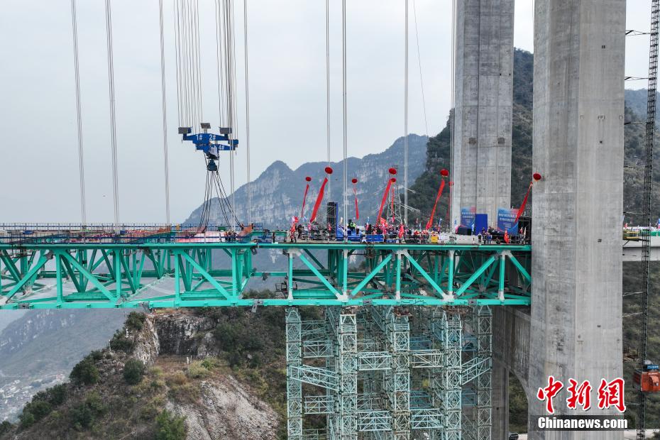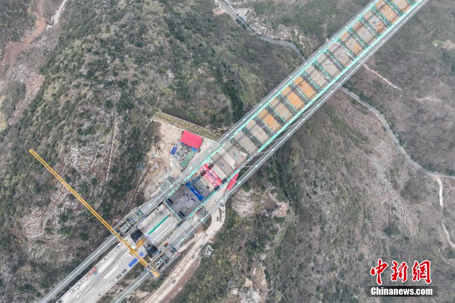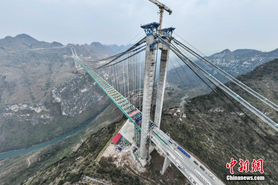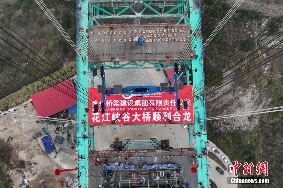 1月17日,贵州省贞丰县,随着最后一节钢桁梁通过世界最大跨度的缆吊系统精准吊装,贵州六枝至安龙高速公路花江峡谷大桥顺利合龙。该大桥主桥跨径1420米,桥面至水面高度625米。建成后,大桥主桥跨径居山区桥梁跨径世界第一,大桥也将超越杭瑞高速北盘江大桥565米的垂直高度,成为新的世界第一高桥,被网友称之为“横竖”都是世界第一。图为待合龙的花江峡谷大桥。(无人机照片)中新社记者 瞿宏伦 摄