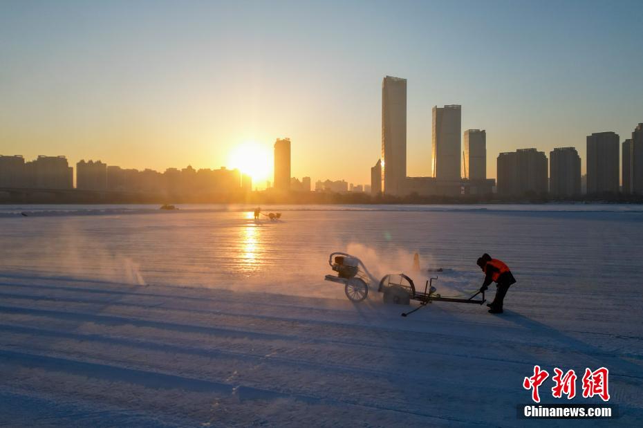 1月17日,黑龙江哈尔滨,工人进行存冰工作。近日,第二十七届哈尔滨冰雪大世界存冰工作开启。在冰封的松花江面上,采冰人在冰层上拉线、量距离,用冰锯划线切割、冰镩凿击冰面,随后将冰块从大冰排上分离并将冰块拉出江面。
