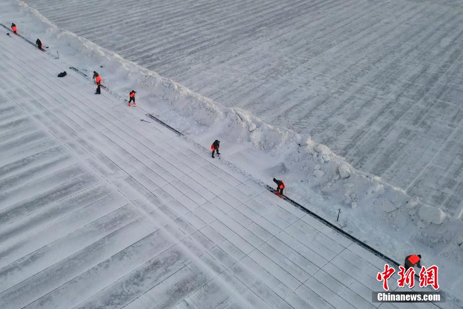 1月17日,黑龙江哈尔滨,工人进行存冰工作。近日,第二十七届哈尔滨冰雪大世界存冰工作开启。在冰封的松花江面上,采冰人在冰层上拉线、量距离,用冰锯划线切割、冰镩凿击冰面,随后将冰块从大冰排上分离并将冰块拉出江面。中新社记者 赵宇航 摄