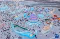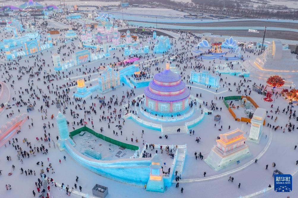 1月23日,游客在哈尔滨冰雪大世界园区内游览(无人机照片)。
