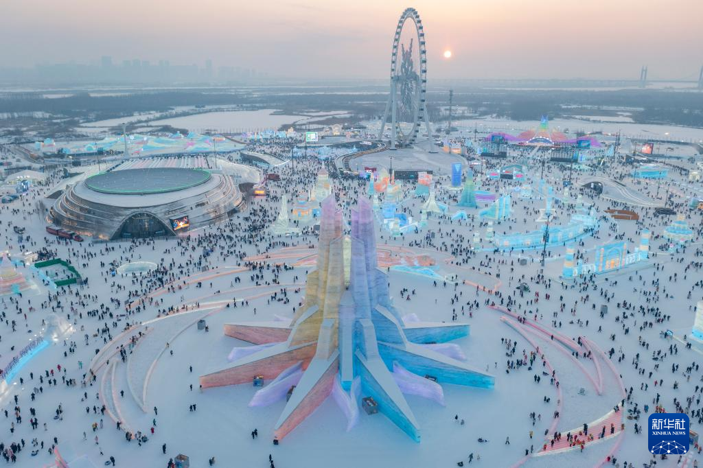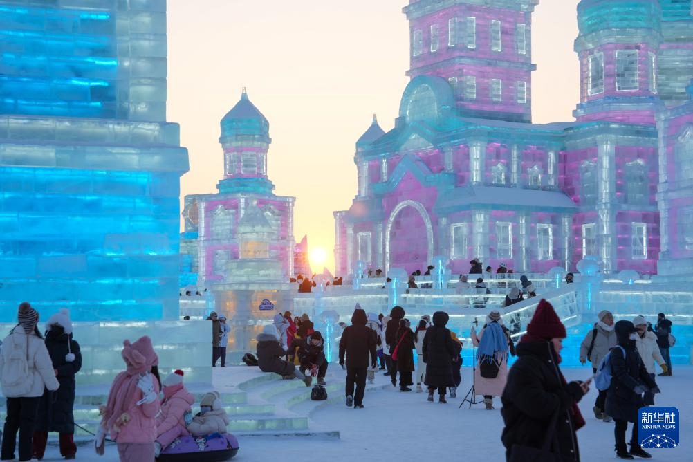 1月23日,夕阳下,游客在哈尔滨冰雪大世界园区内游玩、拍照。