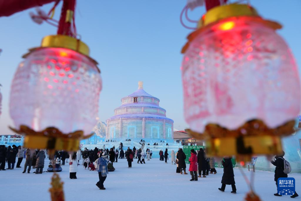 1月23日,游客在哈尔滨冰雪大世界园区内的冰建祈年殿旁边游玩,附近的冰灯笼亮了起来。