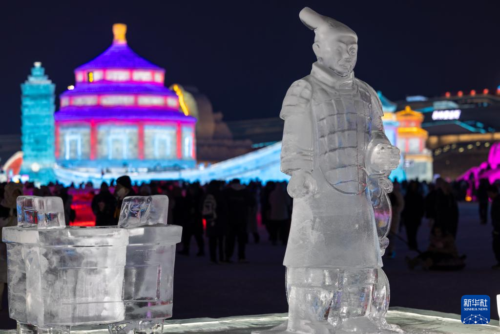 这是1月23日拍摄的在哈尔滨冰雪大世界园区内的“冰马俑”。