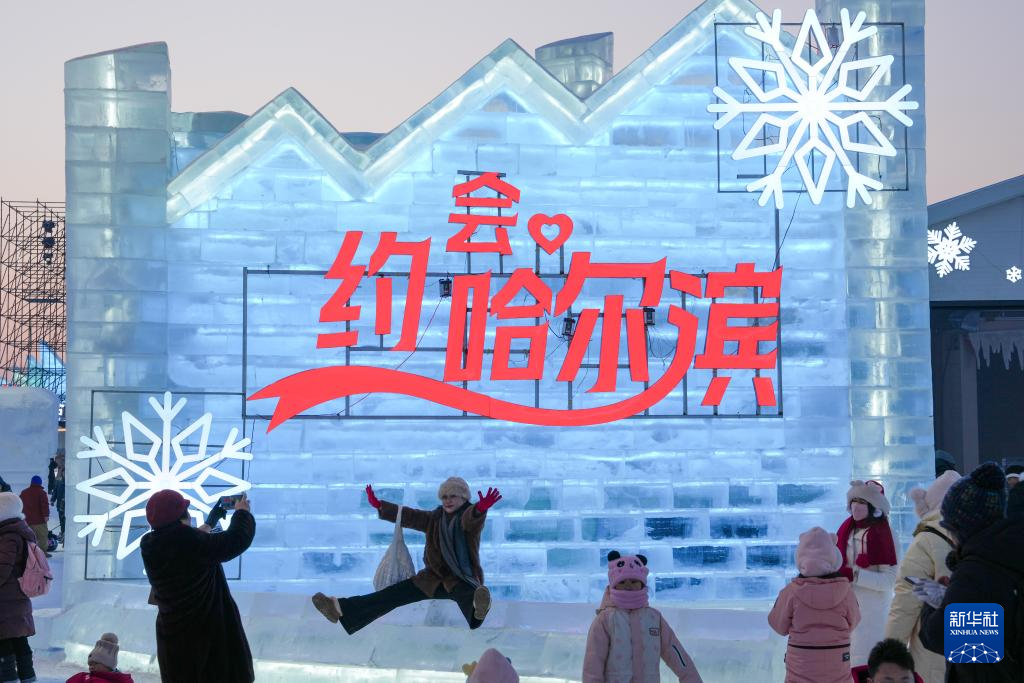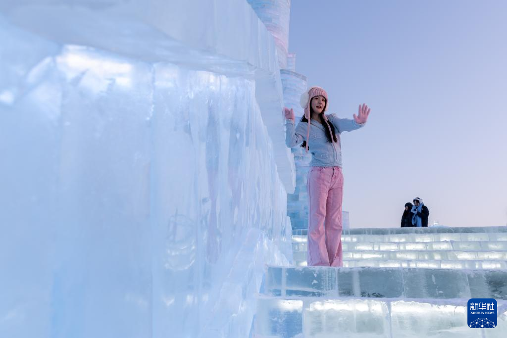 1月23日,游客在哈尔滨冰雪大世界园区内游玩、拍照。