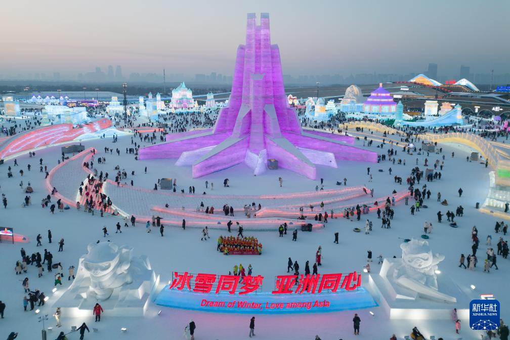 这是1月22日拍摄的本届哈尔滨冰雪大世界主塔“亚洲同心”(无人机照片)。