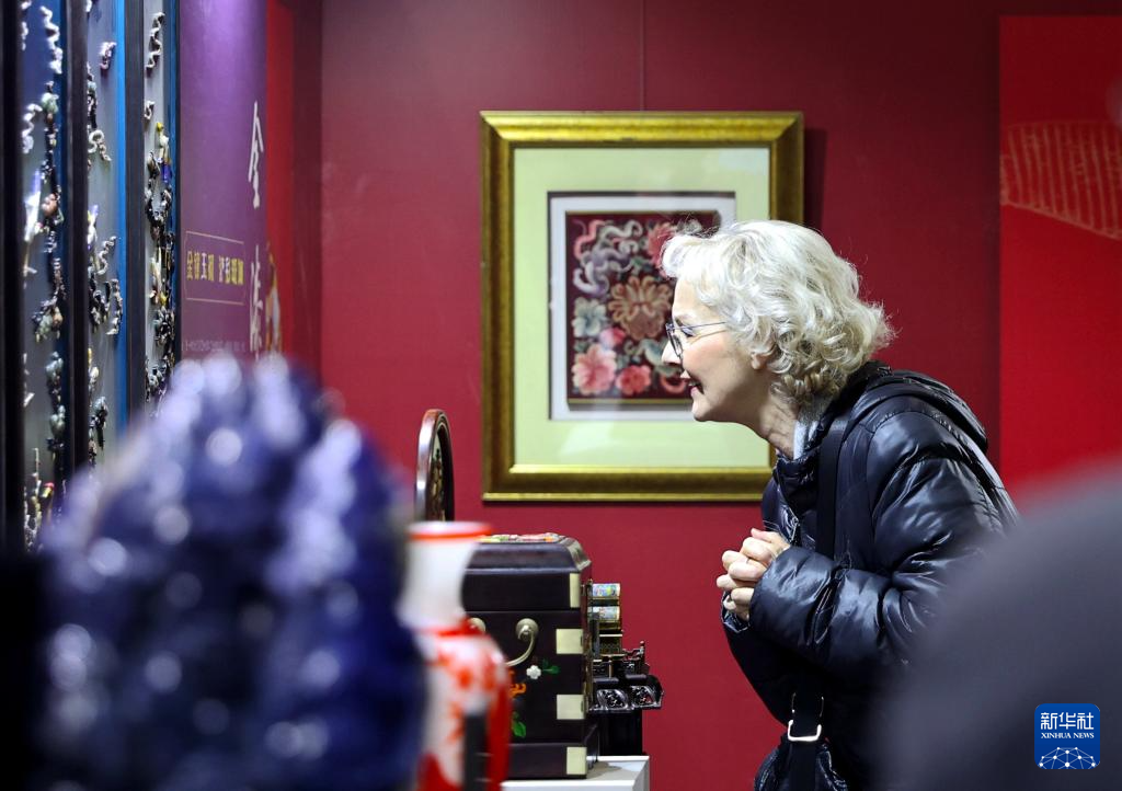 1月23日,驻华使节团成员在廊坊国际年货节上欣赏非遗“百宝嵌”工艺品。