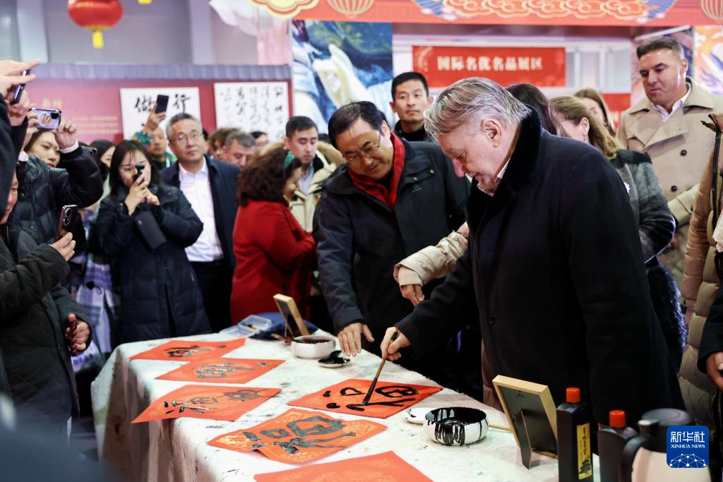 1月23日,驻华使节团成员在廊坊国际年货节上体验中国书法。
