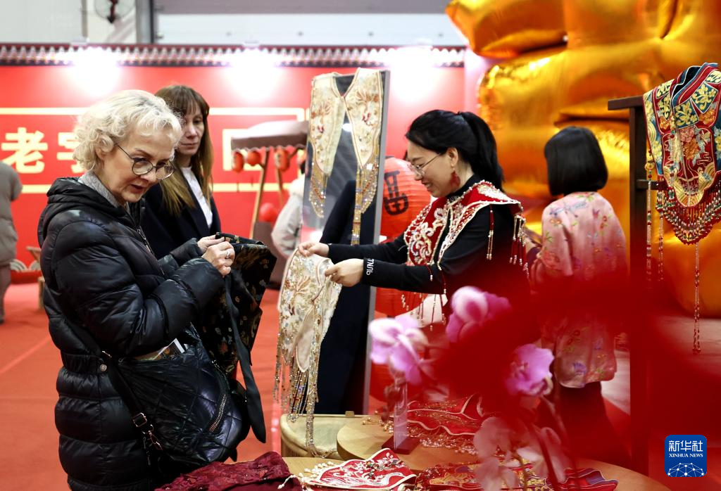 1月23日,驻华使节团成员在廊坊国际年货节上了解“虎头帽”。
