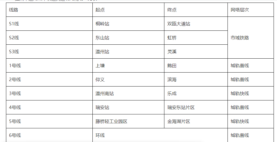 其中,1号线起点上塘,终点鲍田;2号线起点仰义,终点滨海;3号线起点温州南站,终点乐成;4号线起点瑞安站,终点瑞安东站片区;5号线起点藤桥轻工业园区,终点金海湖片区;6号线则为环线。这些线路根据功能不同,分为城轨快线和城轨普线,以满足不同区域的交通需求。