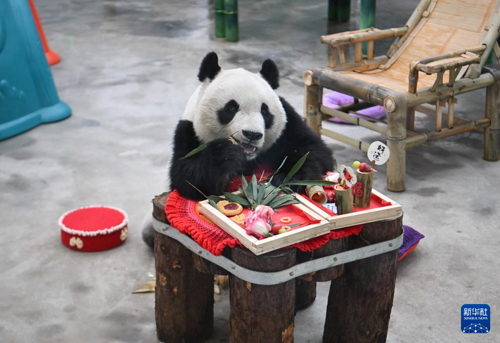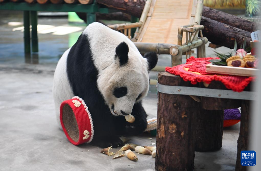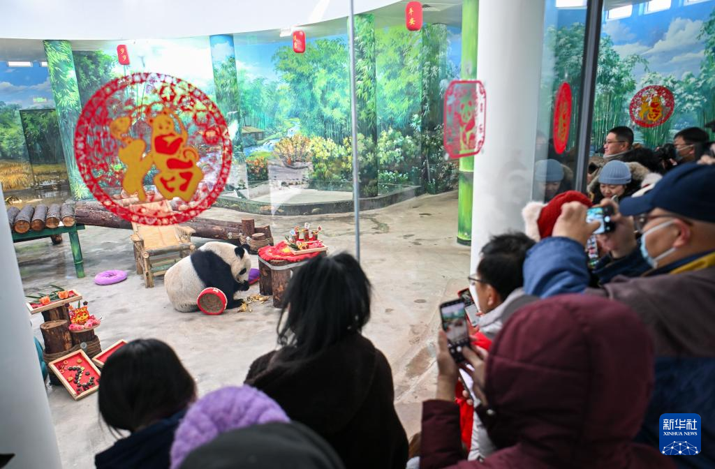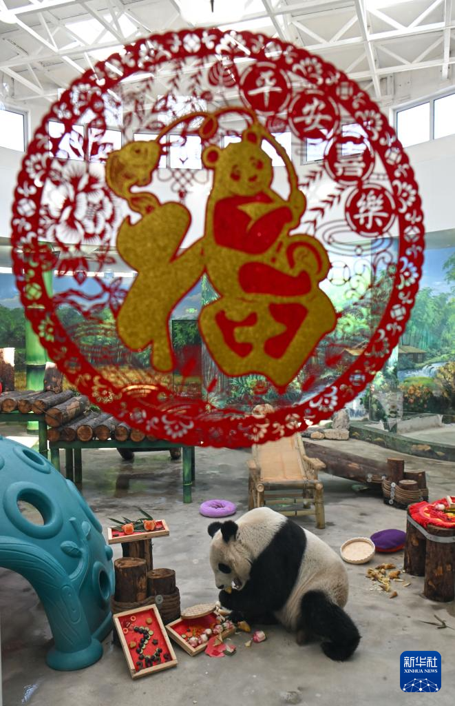 1月27日,在天津动物园熊猫馆,大熊猫“喜乐”享用节日大餐。