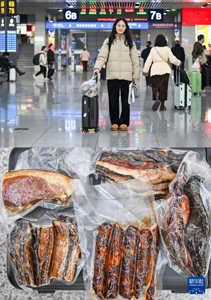 这是一张拼版照片:上图为来自重庆市渝北区仙桃街道的毛靖萱在重庆北站候车,准备返回四川成都工作;下图为她行囊中装着父母为她准备的腊肉、香肠等(2月4日摄)。