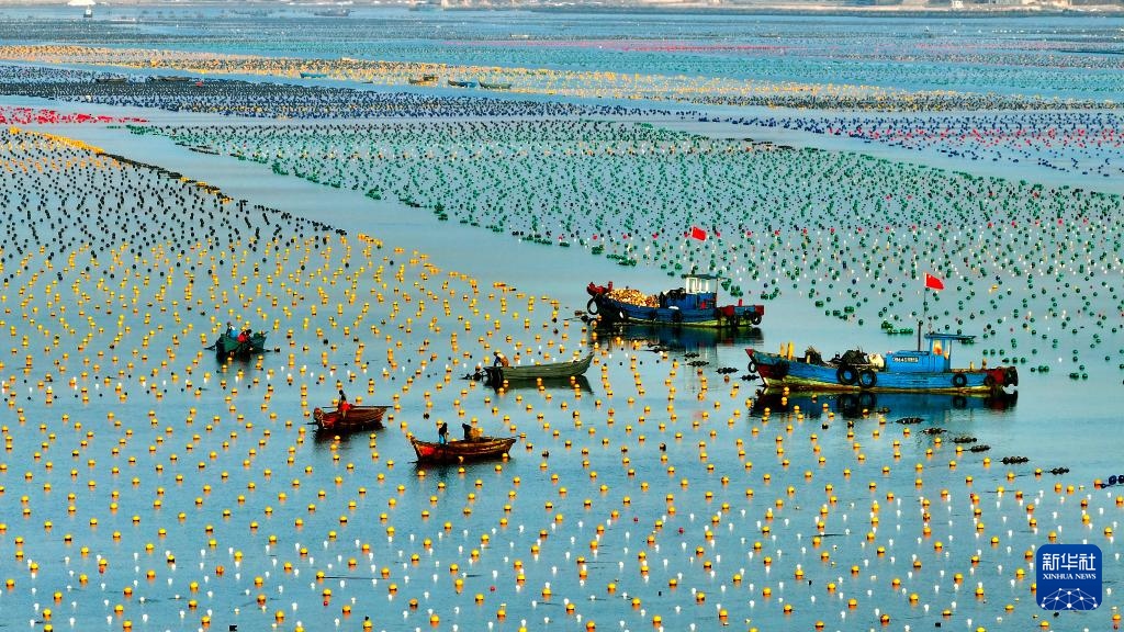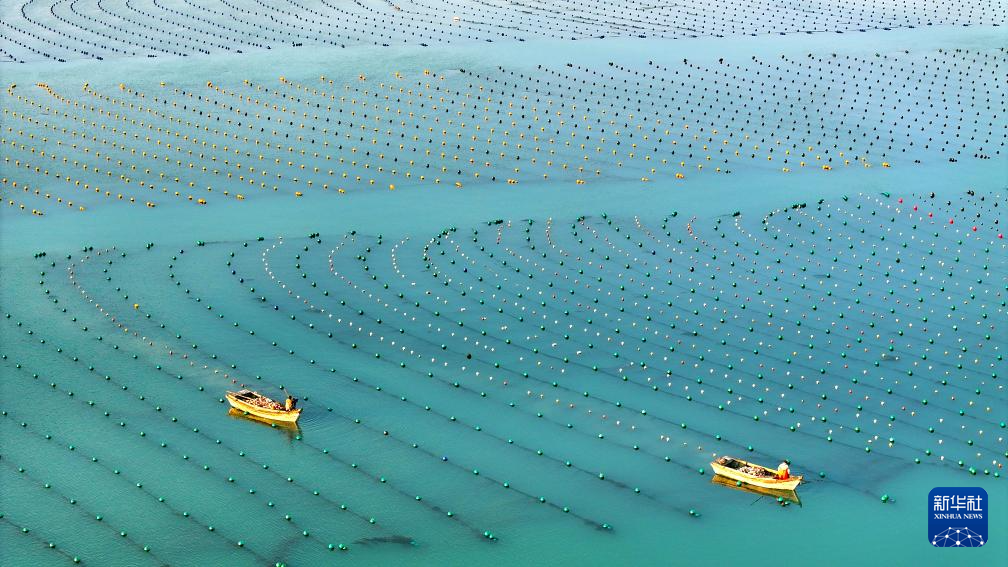 2月11日,在山东省荣成市爱伦湾海洋牧场海带养殖区,养殖工人在加装海带浮筏(无人机照片)。